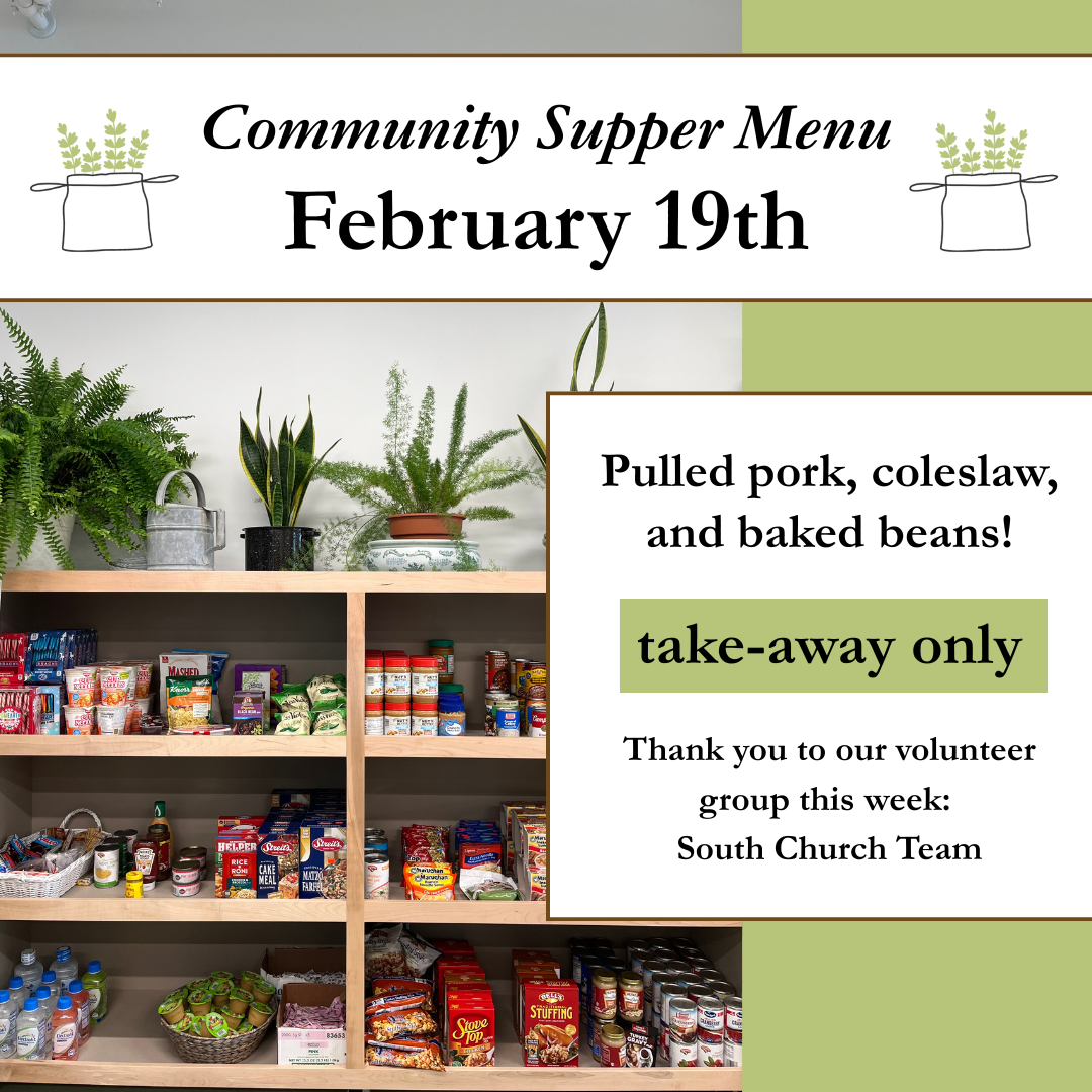 February 19th: Pulled pork, coleslaw, and baked beans! Please note, we’ll be offering take-away only for the month of February. Pick up is from 4-5pm, and everyone is welcome.