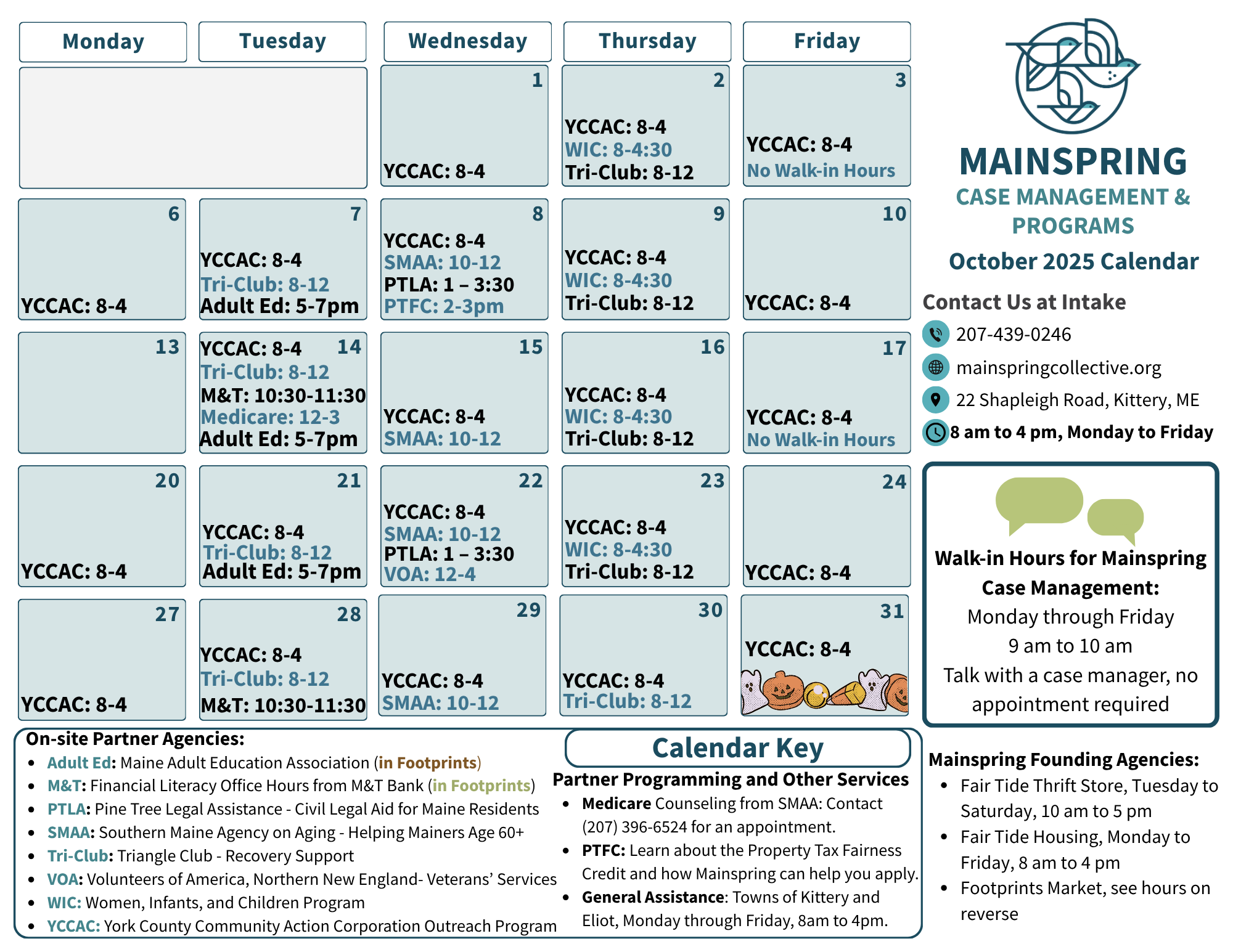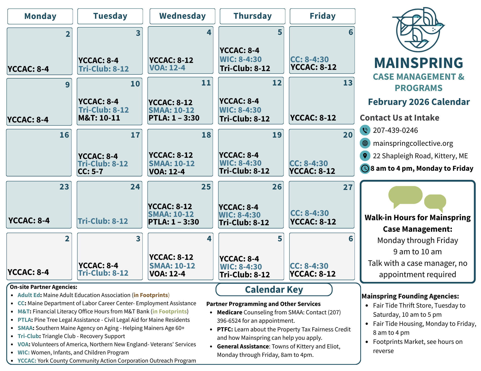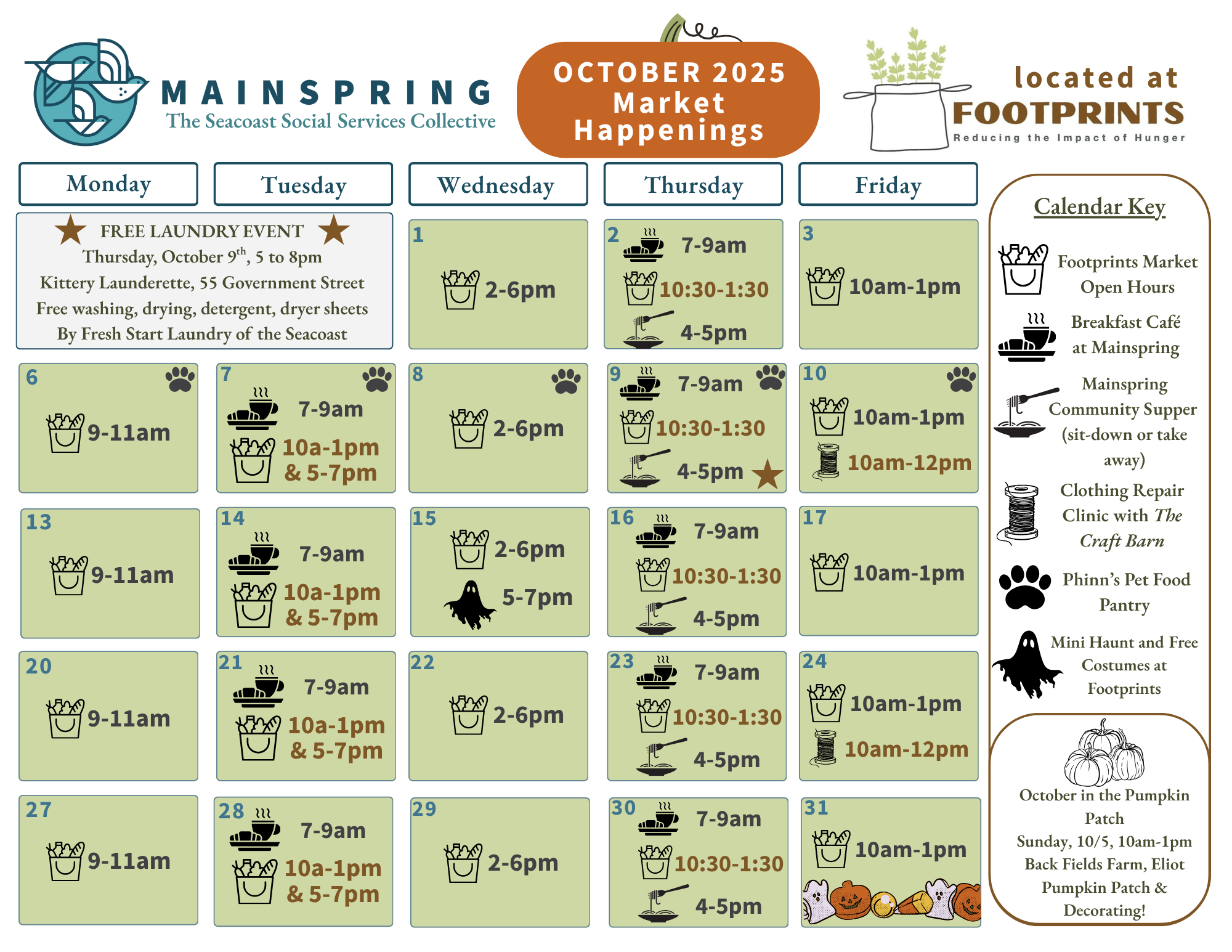 This month’s calendar is your guide to everything happening at Mainspring. On the left, you’ll see the Mainspring Case Management & Services calendar, showing when agency partners will be on-site and the open-door hours for case management. On the right, you’ll find Footprints’ calendar—including market hours, the Breakfast Café, Community Supper, and more. Whether you're looking for a meal, fresh groceries, or support navigating services, these calendars help you know what’s available and when. Click on the calendar to download and print your copy!