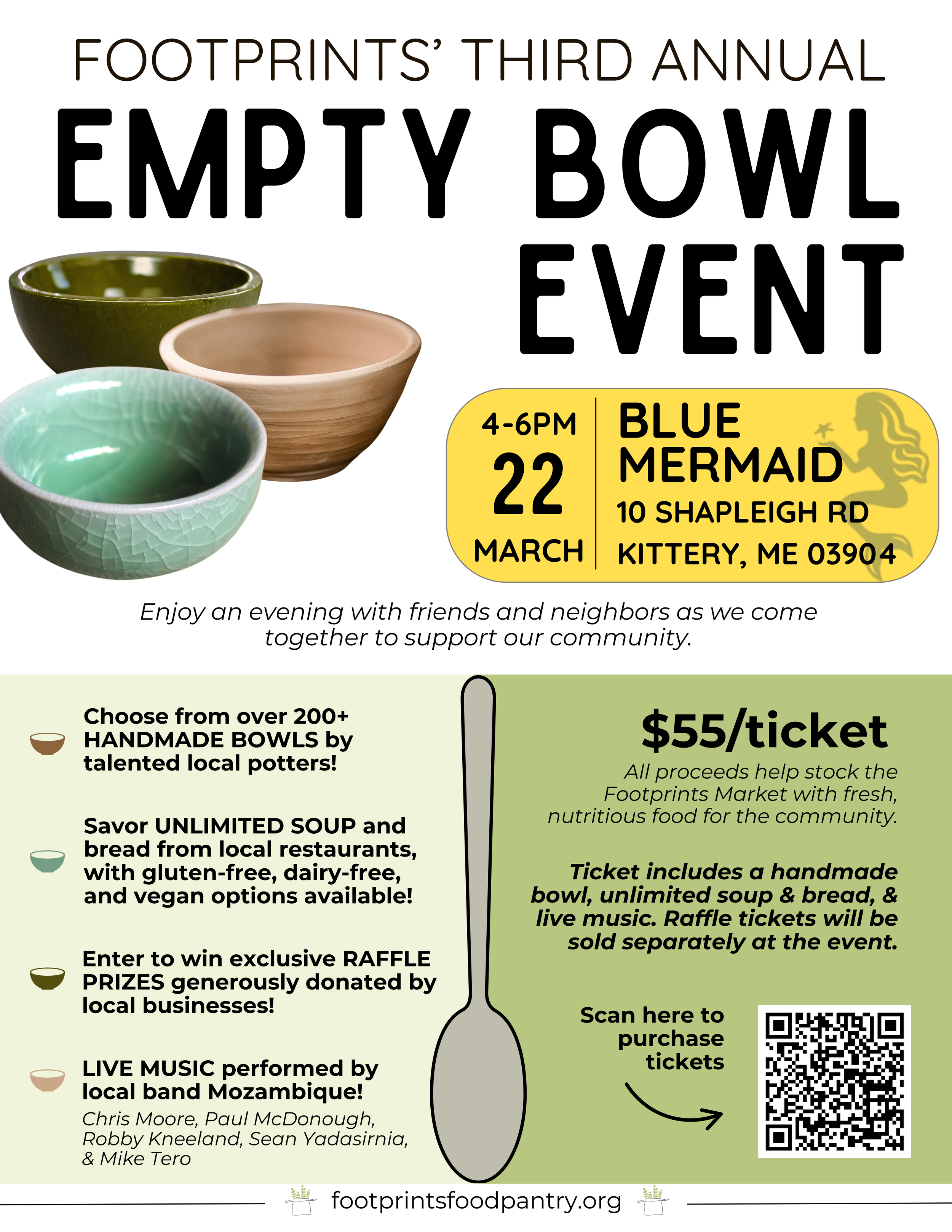 Empty Bowl events are held by food pantries nationwide to raise awareness and critical funds to address food insecurity in our communities. At Footprints’ Third Annual Empty Bowl Event, attendees will enjoy unlimited soup and bread donated by local restaurants, live music by local band Mozambique, the chance to win exclusive raffle items and packages, and the choice of a handcrafted bowl to take home, generously donated by local potters. All funds raised at the event will go directly toward stocking our market with fresh, nutritious food, providing groceries to community members living with food insecurity and on low incomes.